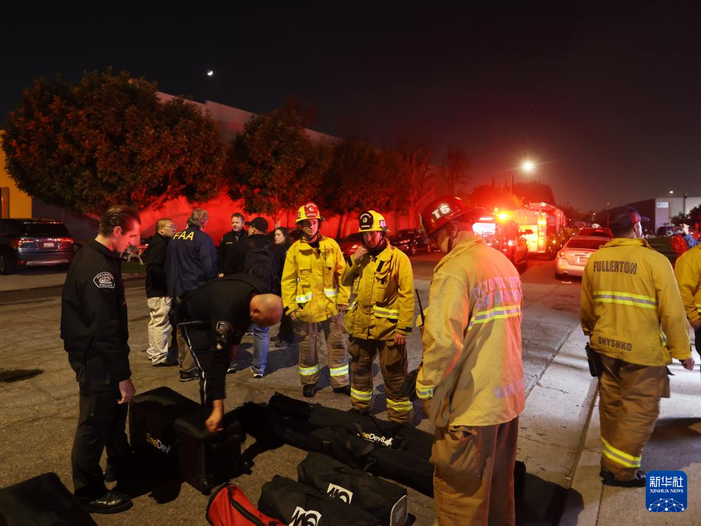 2025年1月2日,消防员、警察和美国联邦航空管理局人员在富勒顿市被飞机撞上的建筑物旁工作。