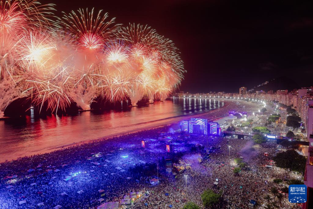 2025年1月1日凌晨,烟花在巴西里约热内卢科帕卡巴纳海滩上空绽放。