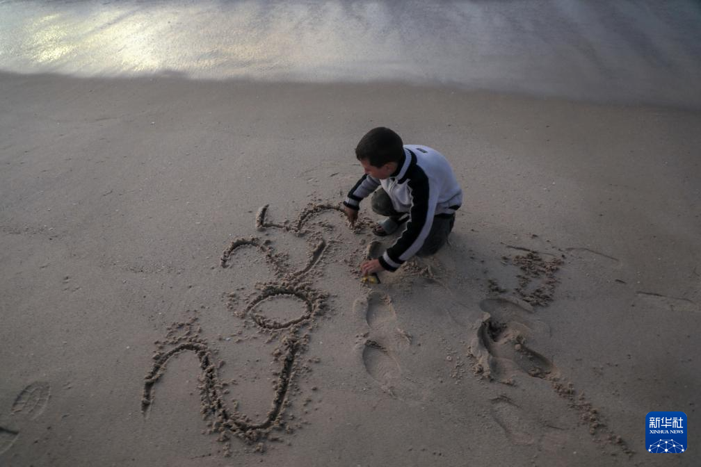 2024年12月31日,一名男孩在加沙地带代尔拜拉赫的海滩写下“2025”字样。