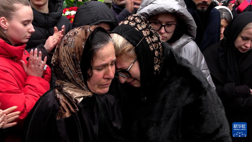 2024年12月29日,在阿塞拜疆巴库举行的遇难机组人员的葬礼上,遇难者亲属相拥哭泣。
