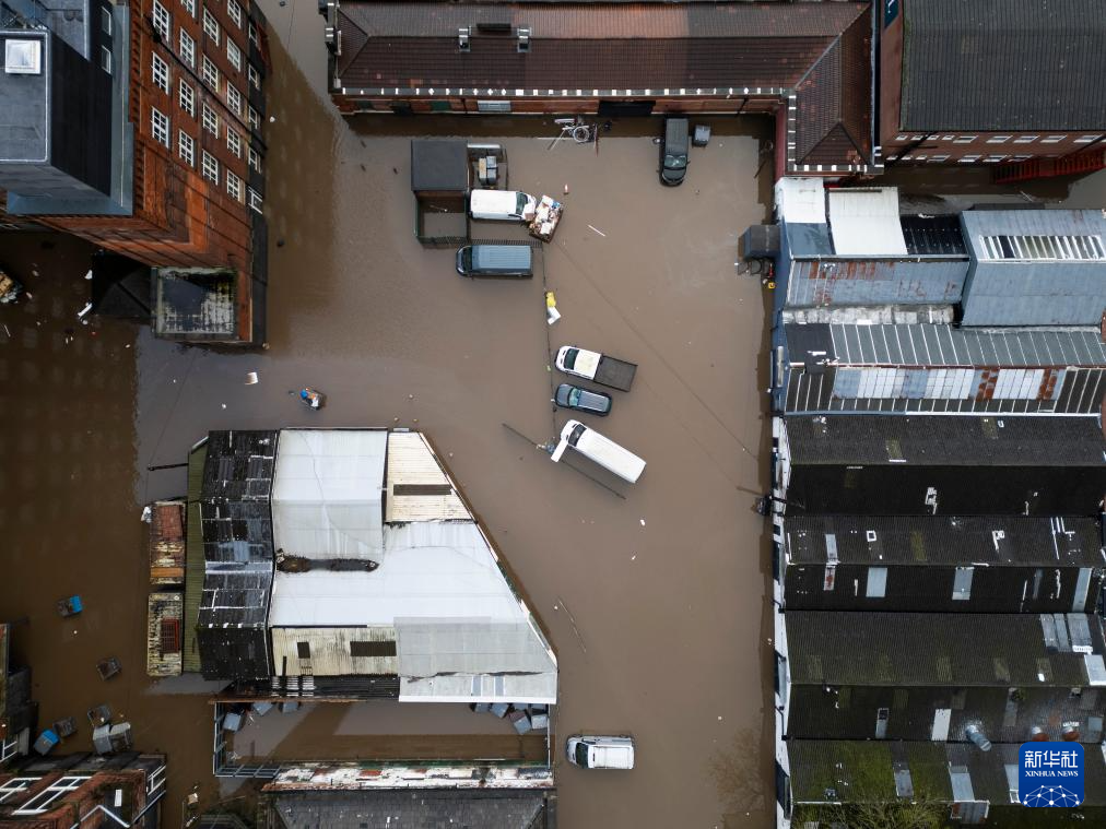 2025年1月1日,在英国曼彻斯特,汽车停放在被洪水淹没的道路上(无人机拍摄)。