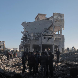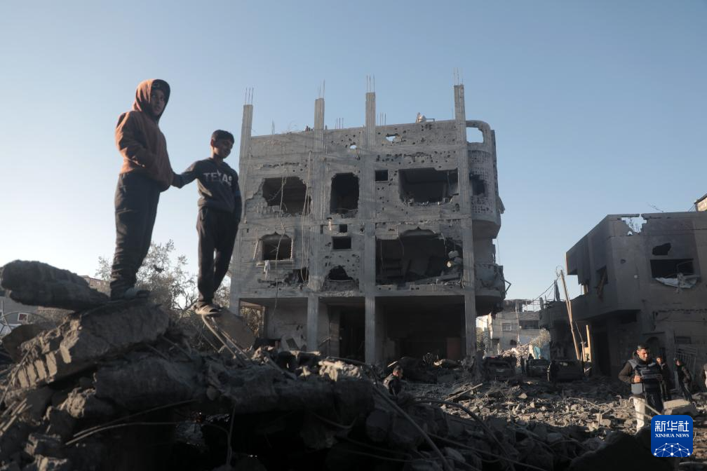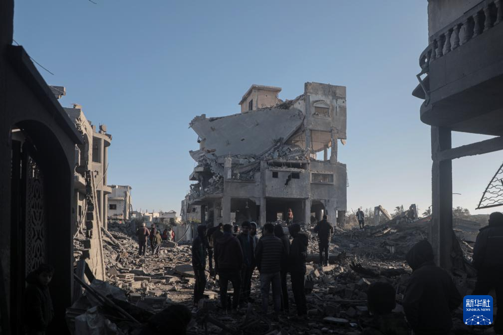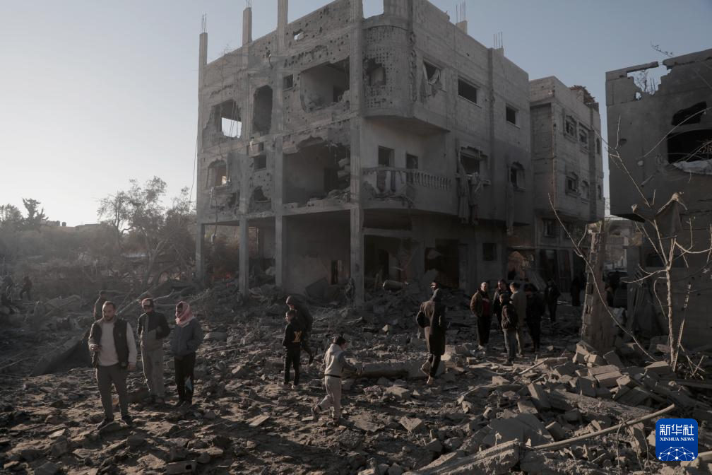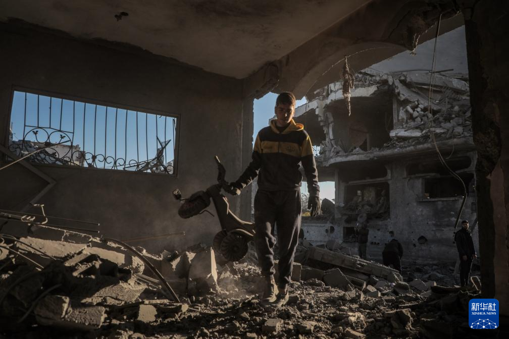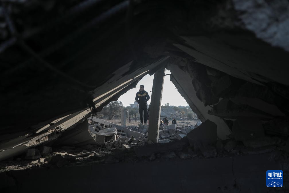 1月3日,在加沙地带中部迈加齐难民营,当地民众查看被以军袭击毁坏的房屋。