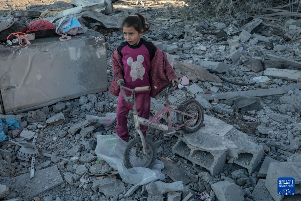 1月3日,在加沙地带中部迈加齐难民营,一名女孩站在废墟中。