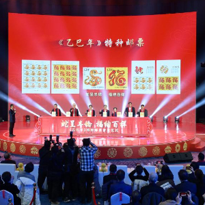 1月5日,在首发仪式上,嘉宾们为《乙巳年》特种邮票揭幕。