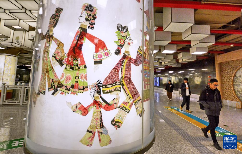 北京地铁19号线平安里站的皮影戏灯箱(1月4日摄)。