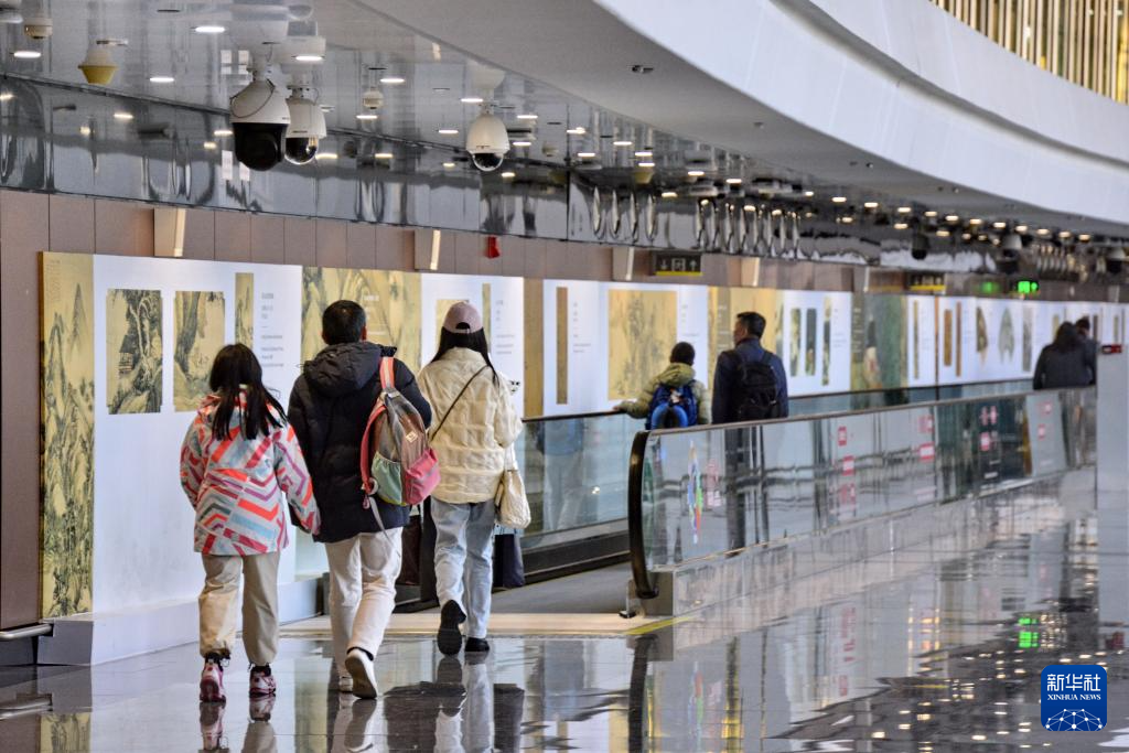 在北京大兴机场,旅客在参观机场与中国国家博物馆联手打造的“文化中国”长廊(1月4日摄)。