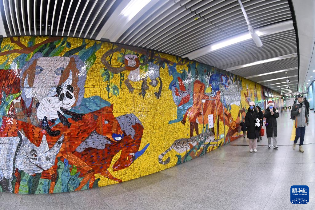 北京地铁4号线动物园站的瓷片拼接美术作品(1月1日摄)。