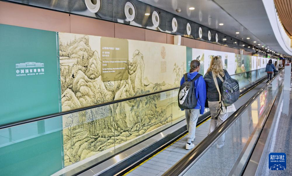 在北京大兴机场,旅客从机场与中国国家博物馆联手打造的“文化中国”长廊旁经过(1月4日摄)。