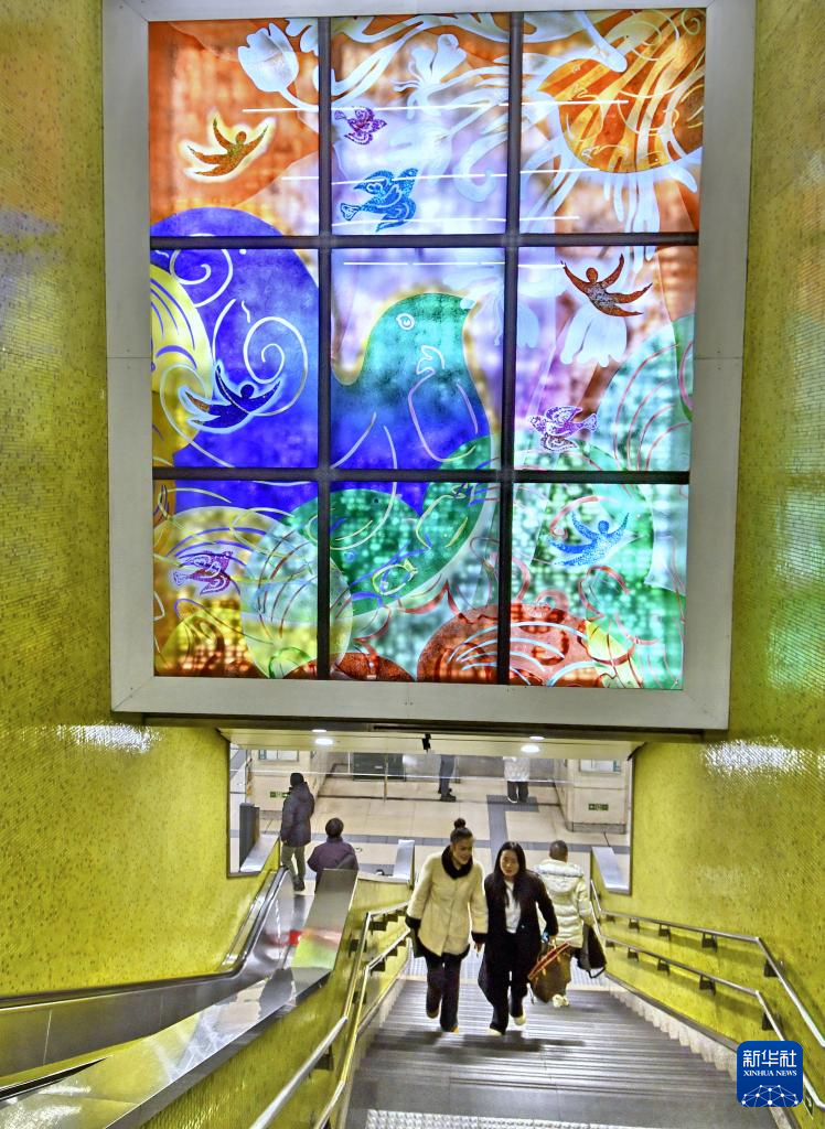 北京地铁8号线林萃桥站的彩雕玻璃作品(1月1日摄)。