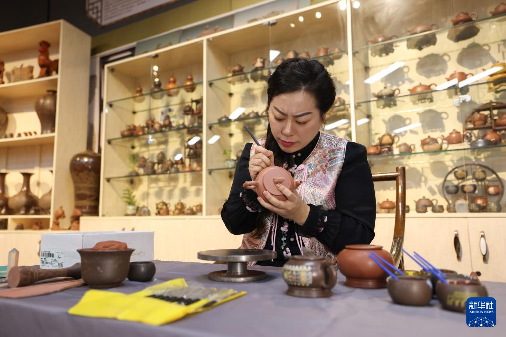 1月2日,郭卉在工作室里为雕刻好的茶壶彩绘。