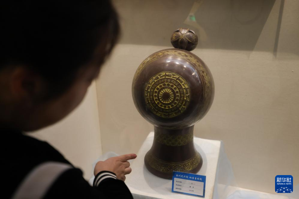 1月3日,郭卉在钦州坭兴陶博物馆介绍自己的作品《三月三》。