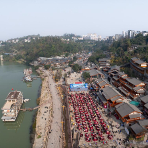 1月5日,在武胜县沿口古镇,人们共吃庖汤宴(无人机拍摄)。