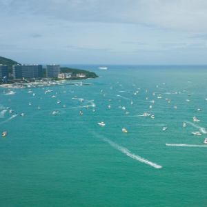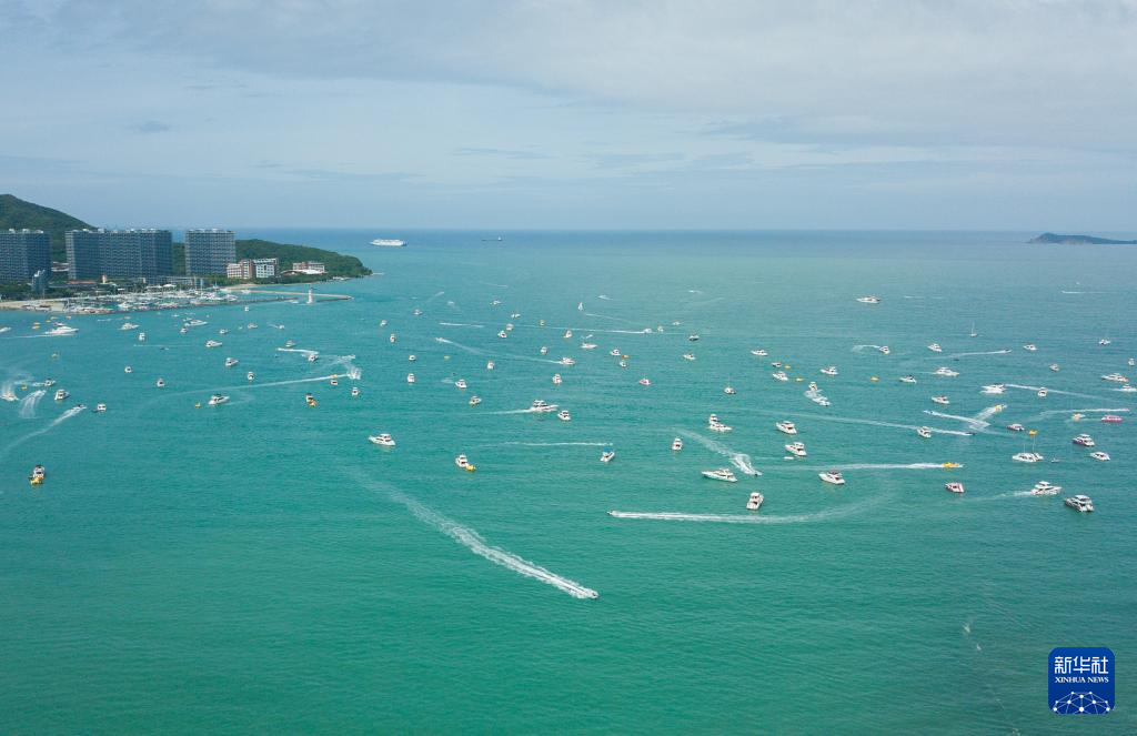 游客乘游艇在海南三亚游玩(2024年7月23日摄,无人机照片)。