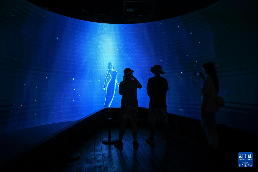 游客在位于海南陵水的海南疍家博物馆观看动画(2024年7月26日摄)。