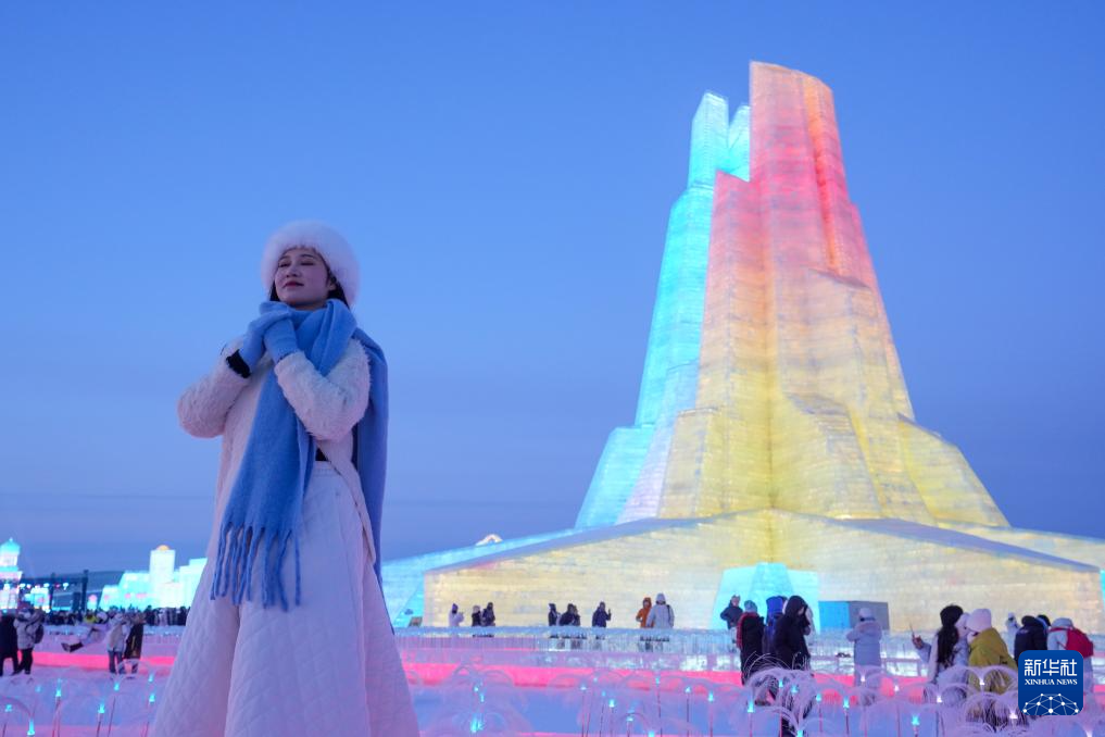1月5日,游客在哈尔滨冰雪大世界园区内游玩、拍照。