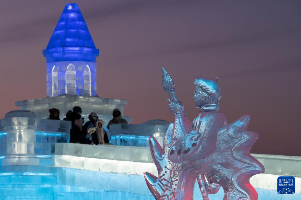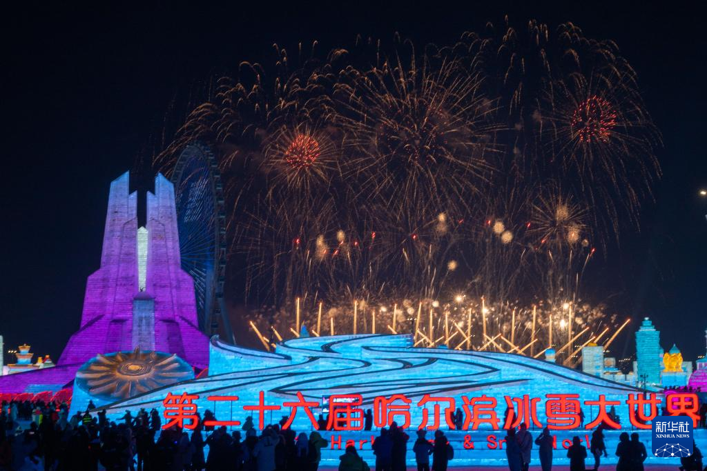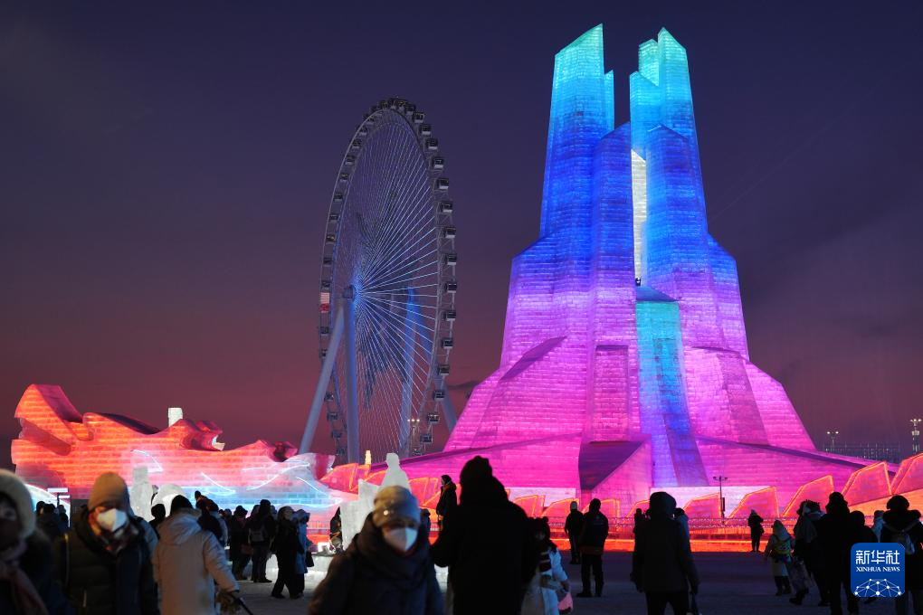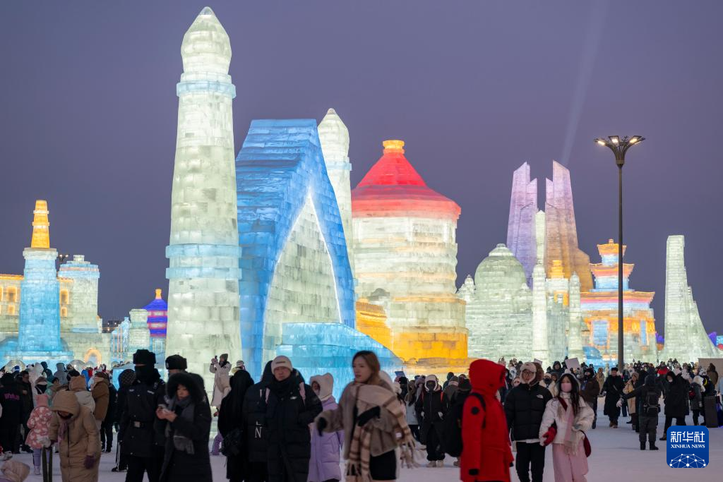 1月5日,在哈尔滨冰雪大世界园区,人们观看第41届中国·哈尔滨国际冰雪节开幕式。