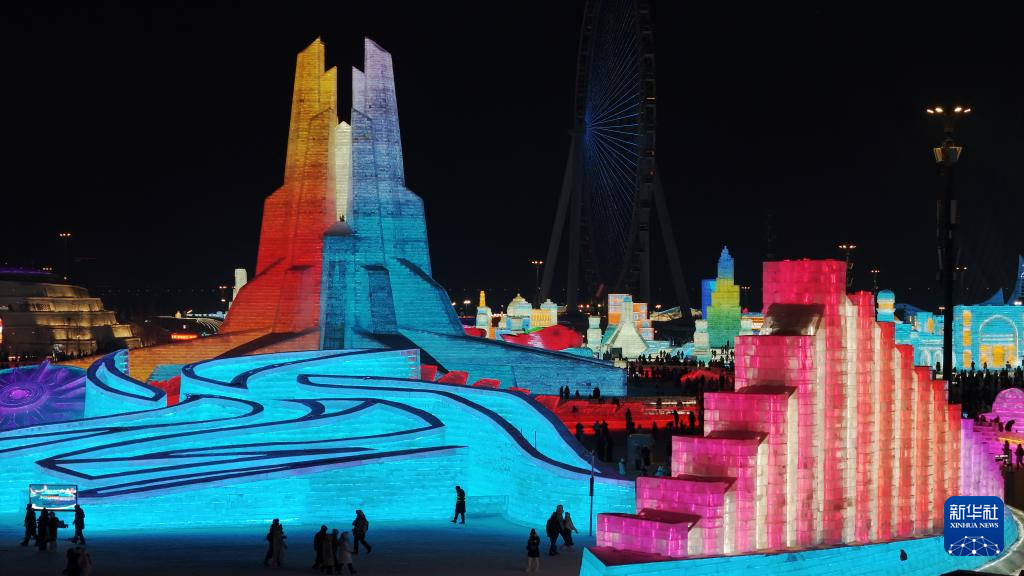 1月5日,在哈尔滨冰雪大世界园区,游客在主塔“亚洲同心”附近游玩(无人机照片)。