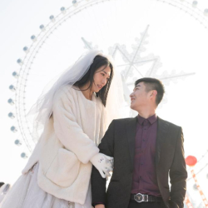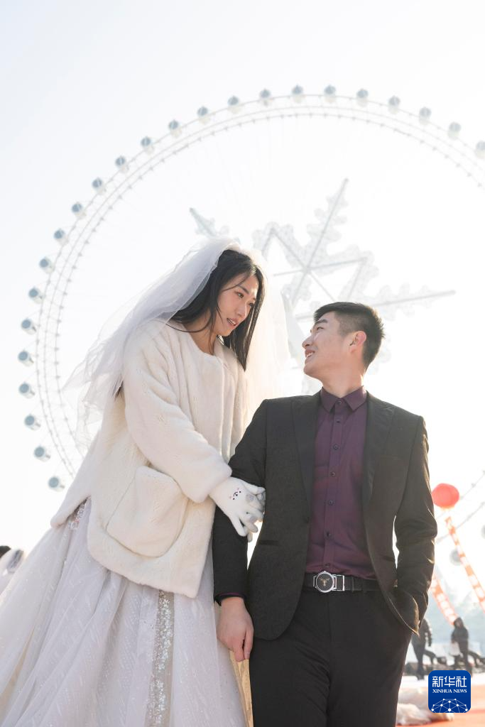 1月6日,在哈尔滨冰雪大世界园区,新人在雪花摩天轮下留影。