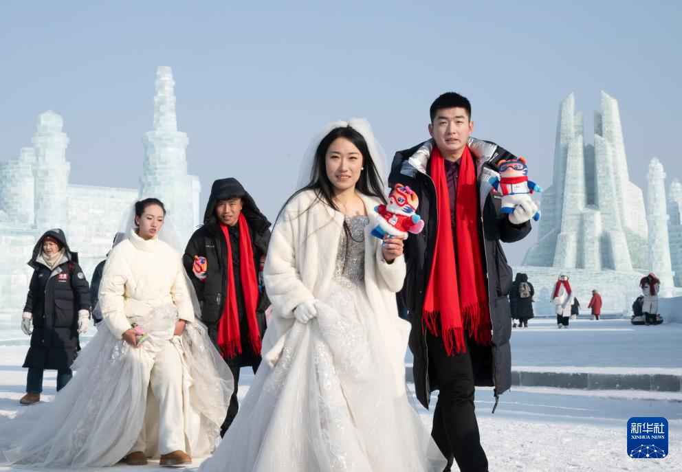 1月6日,在哈尔滨冰雪大世界园区,新人参加公益冰雪集体婚礼。