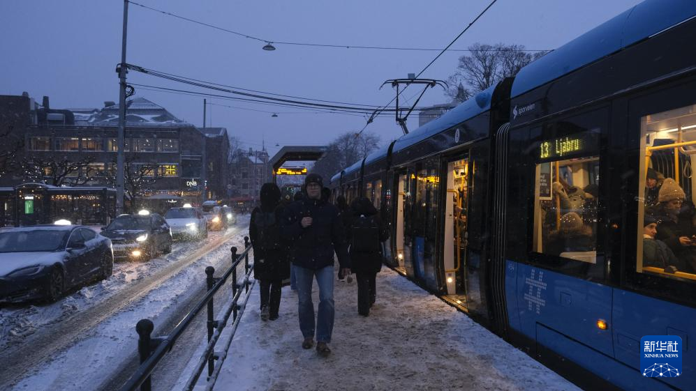 1月6日,在挪威首都奥斯陆,乘客在雪中上下车。