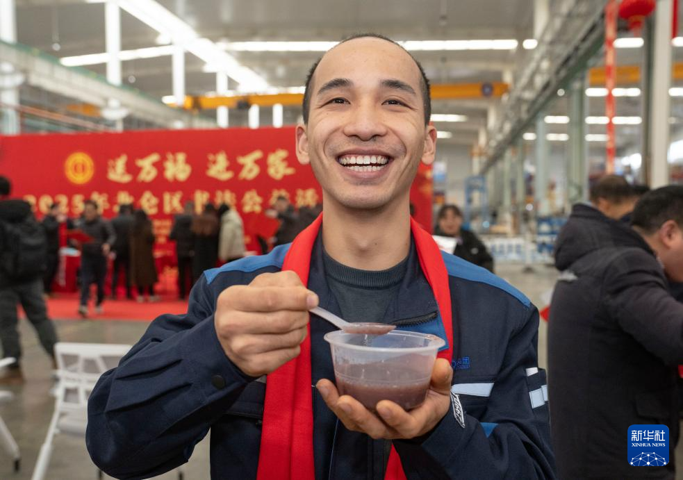 1月7日,职工代表在“送万福 进万家”书法公益活动上喝腊八粥。