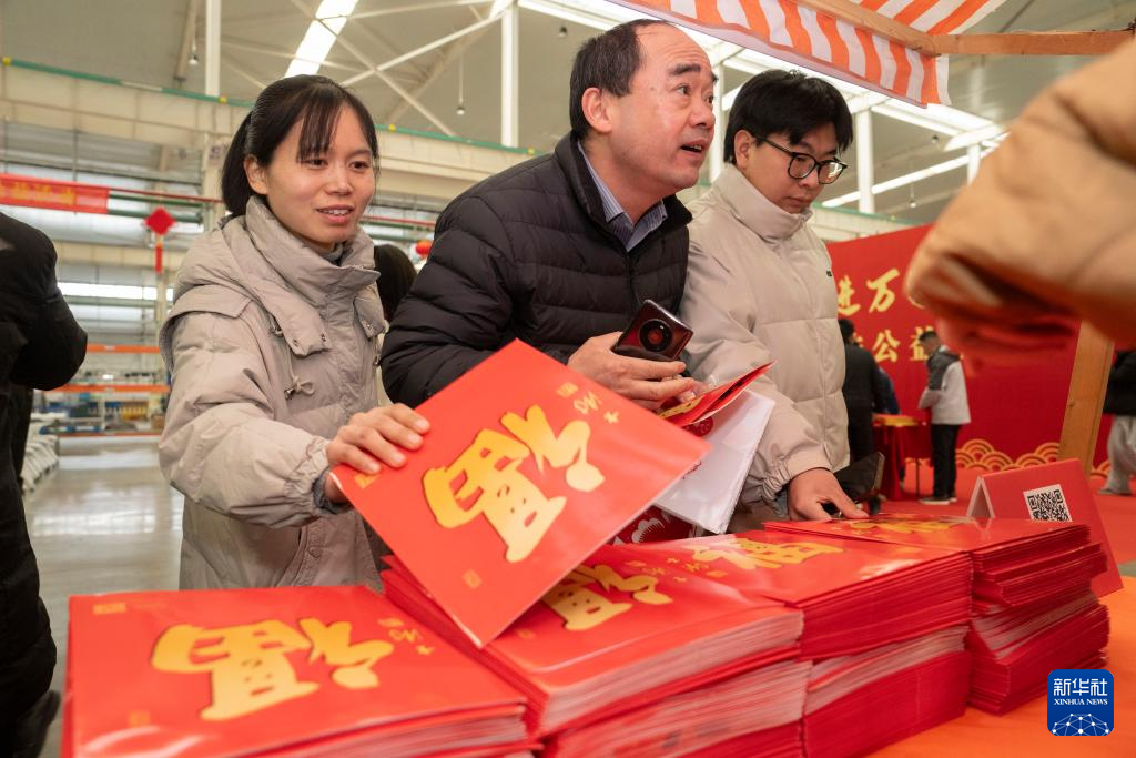 1月7日,职工代表在“送万福 进万家”书法公益活动上领取福袋。
