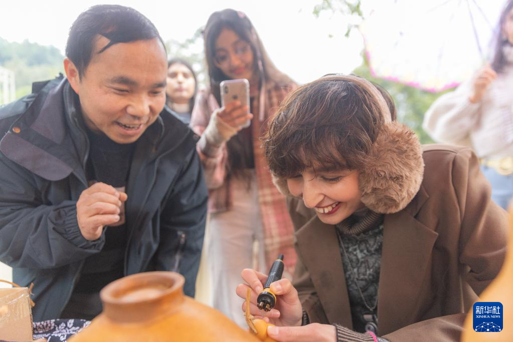 1月7日,在重庆市北碚区偏岩古镇,留学生体验葫芦雕刻。