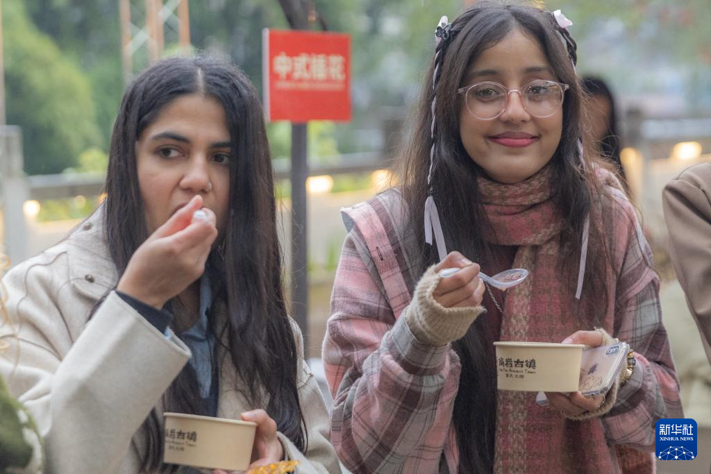 1月7日,在重庆市北碚区偏岩古镇,留学生品尝腊八粥。