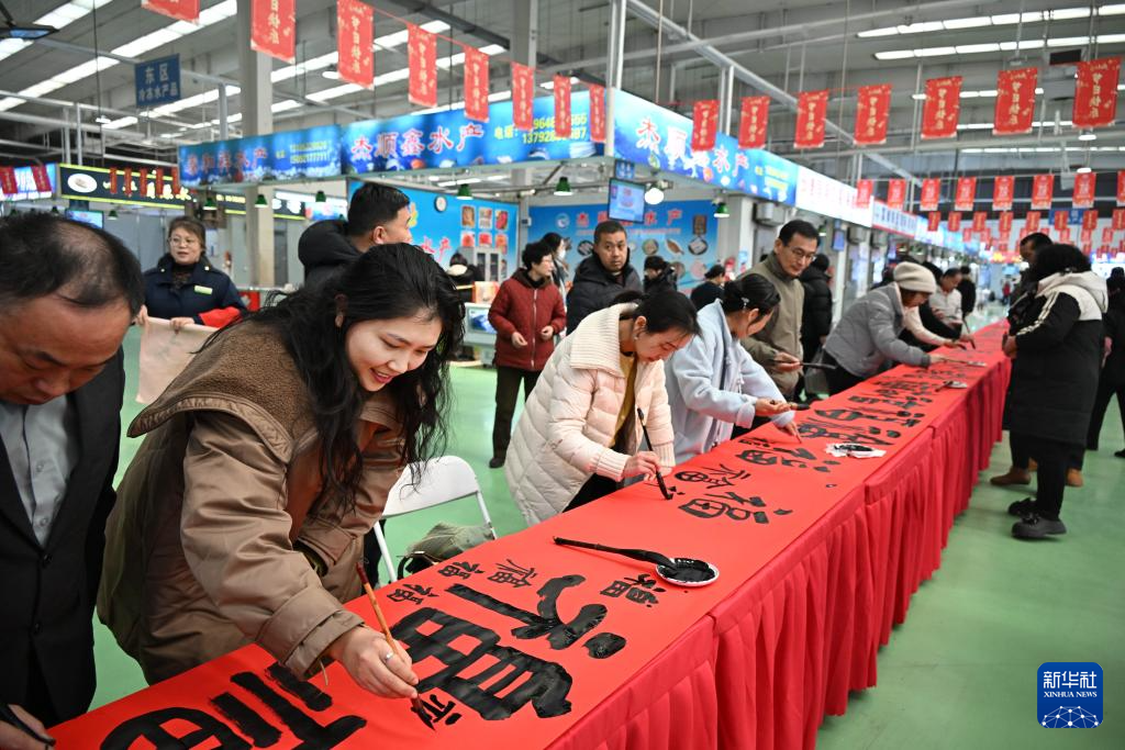 1月7日,人们在“海洋大集”上共同书写福字。