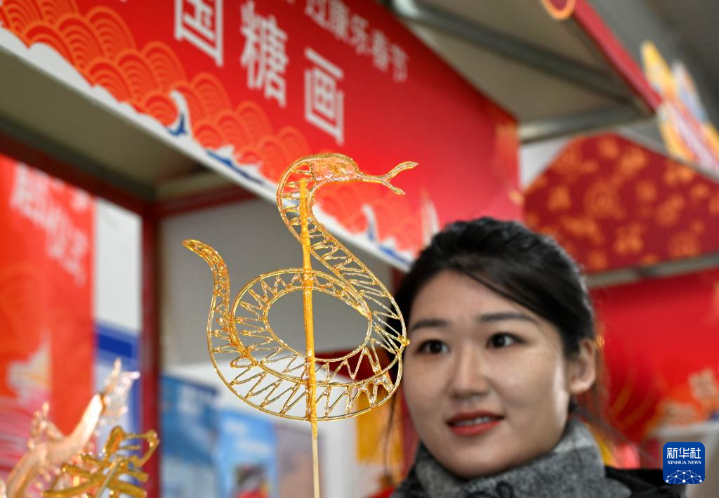 1月7日,一名女子在“海洋大集”非遗文化市集上选购糖画。