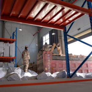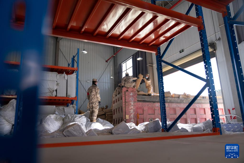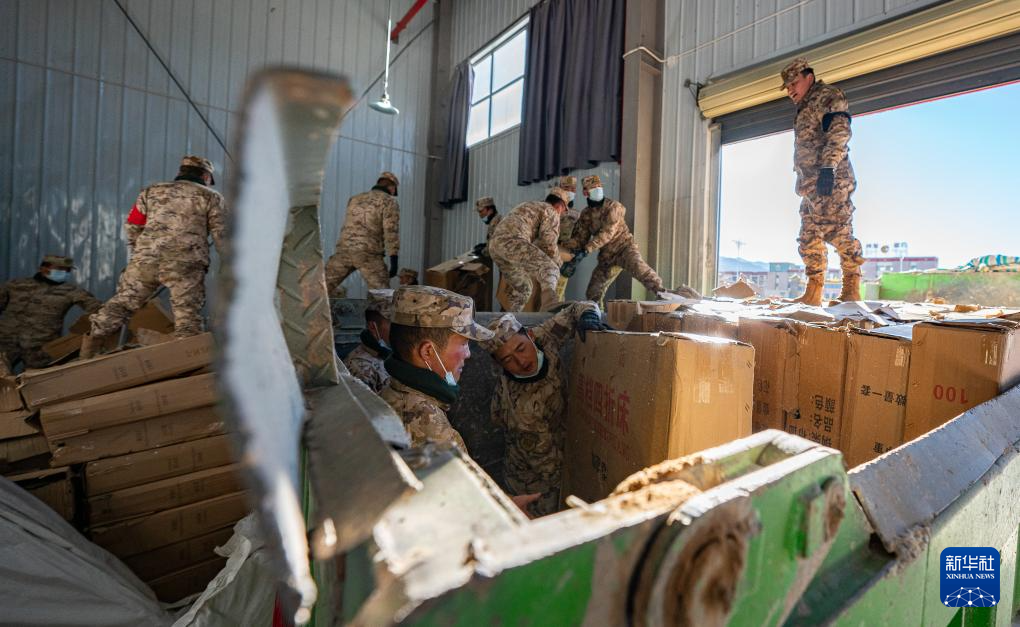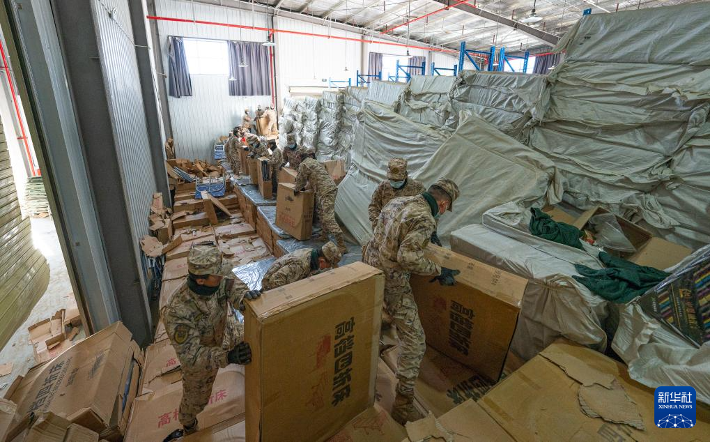1月8日,在日喀则市经开区物资储备仓库,武警官兵在搬运抗震救灾物资。