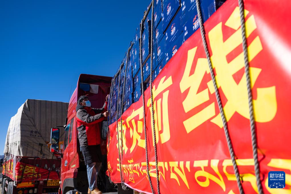 1月8日,在日喀则市境内的318国道旁,当地企业工作人员在用绳子固定抗震救灾物资。