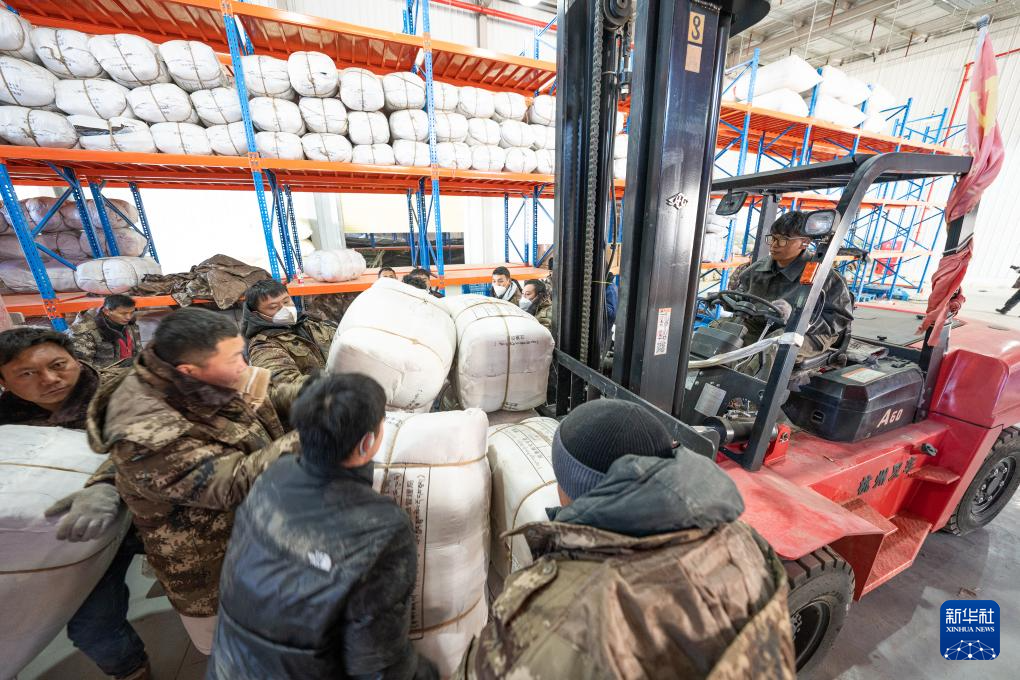 1月8日,在日喀则市经开区物资储备仓库,当地干部群众搬运抗震救灾物资。