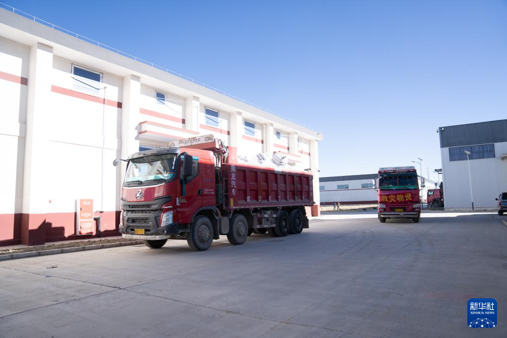 1月8日,在日喀则市经开区物资储备仓库,装好抗震救灾物资的车辆驶出园区。