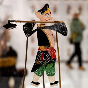 1月8日,市民在西安大唐芙蓉园内的非遗年货集市上选购汪氏皮影文创产品。
