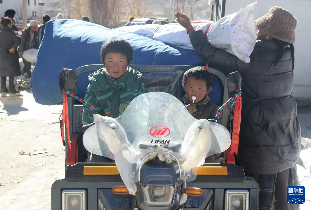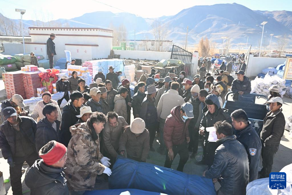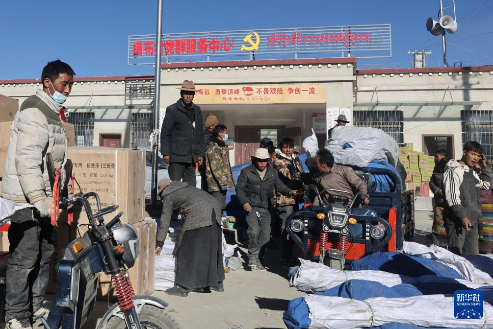 1月9日,受灾群众在措布村卸载救灾物资。
