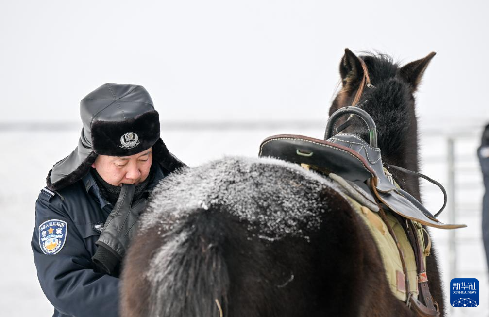 2024年12月27日,马背警队民警赛音白乙拉给马套上马鞍,准备巡边踏查。