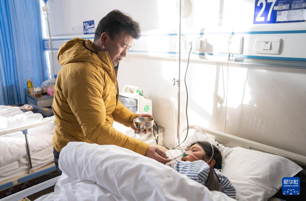 1月9日,在日喀则市人民医院妇产科病房,产妇家人在喂产妇吃饭。