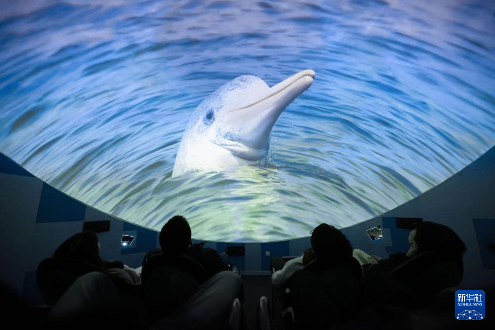 1月5日,在北部湾大学鲸豚5D球幕影院,人们观看由北部湾鲸豚研究团队拍摄制作的纪录短片。