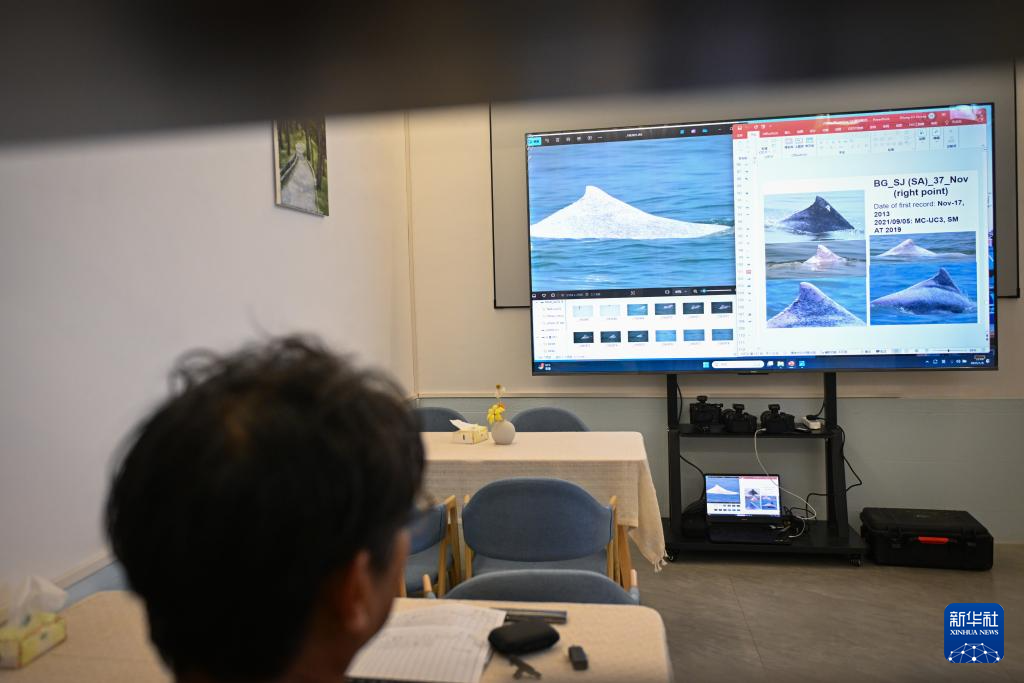 1月6日,北部湾鲸豚研究团队成员黄祥麟在驻地通过照片对中华白海豚进行个体识别。