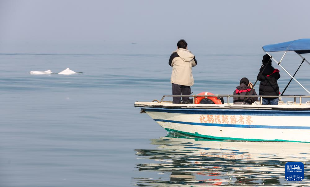1月6日,在三娘湾-大风江口一带海域,北部湾鲸豚研究团队成员在考察船上拍摄中华白海豚。
