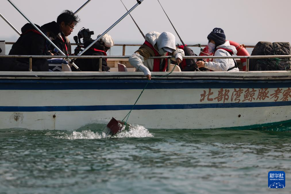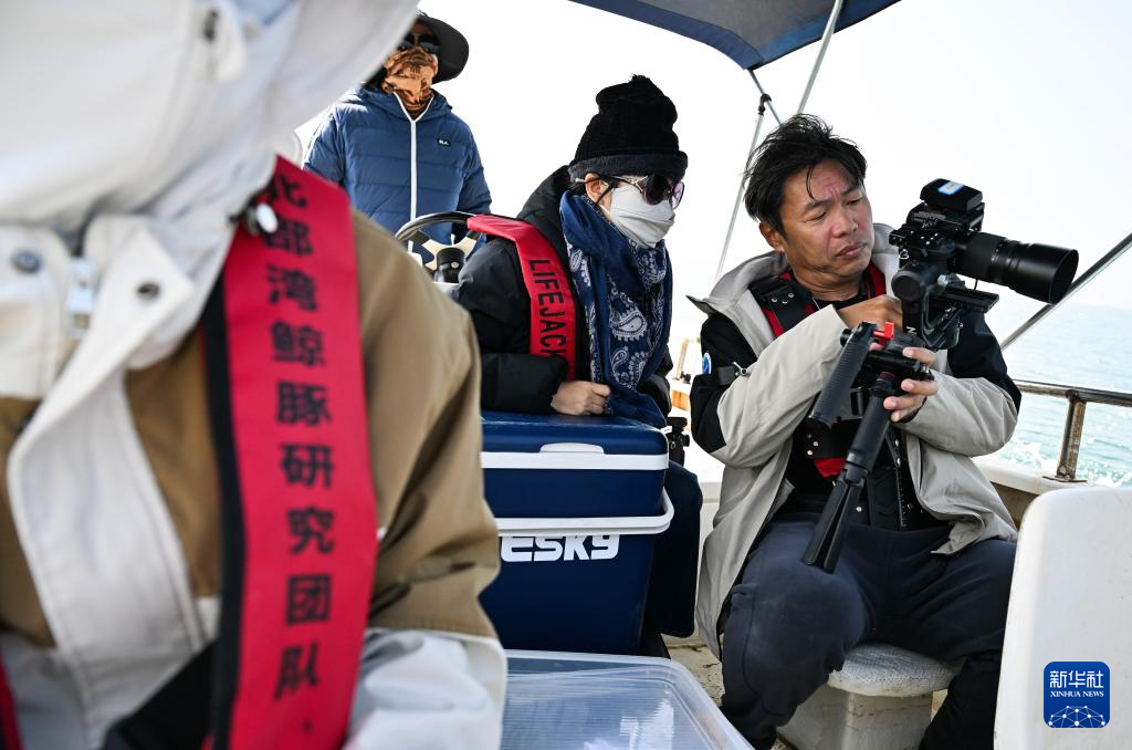 1月6日,在三娘湾-大风江口一带海域,北部湾鲸豚研究团队成员黄祥麟(左一)在考察船上拍摄影像素材。