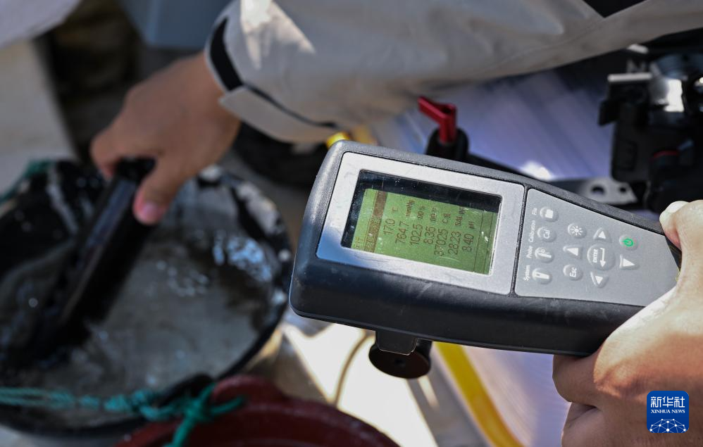 1月6日,在三娘湾-大风江口一带海域,北部湾鲸豚研究团队成员黄祥麟在考察船上手持仪器读取海水样本的盐度、温度等数据。