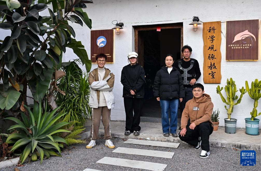 1月6日,北部湾鲸豚研究团队成员陈熔烽、凌乙荣、吴海萍、黄祥麟、翟跃岚(从左至右)在钦州三娘湾景区科学观豚教室前合影。
