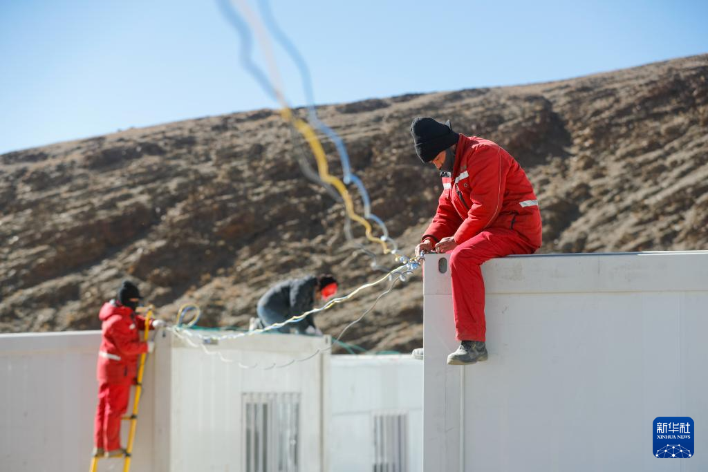 1月10日,在定日县长所乡古荣村,工人在为板房搭设电路。