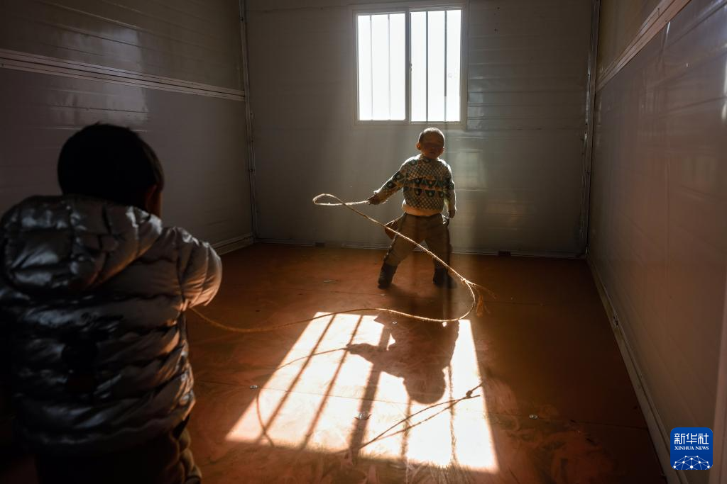1月10日,在定日县长所乡古荣村,两名小朋友在板房内玩耍。