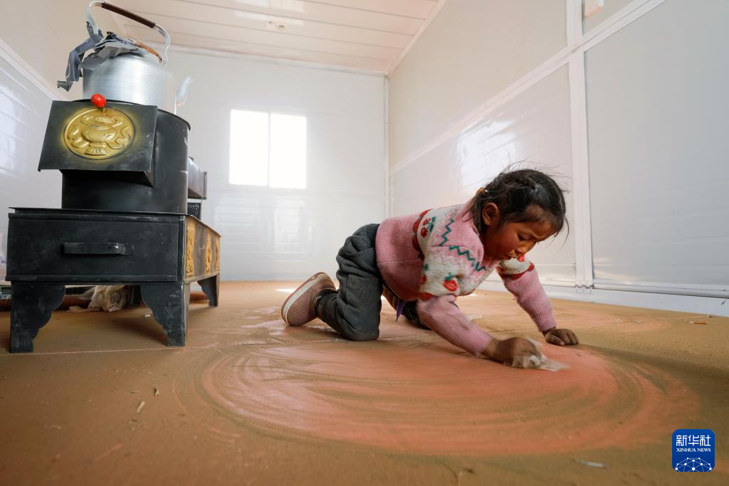 1月10日,在定日县长所乡古荣村,一名小朋友搬入板房后帮助家人清理板房地板。