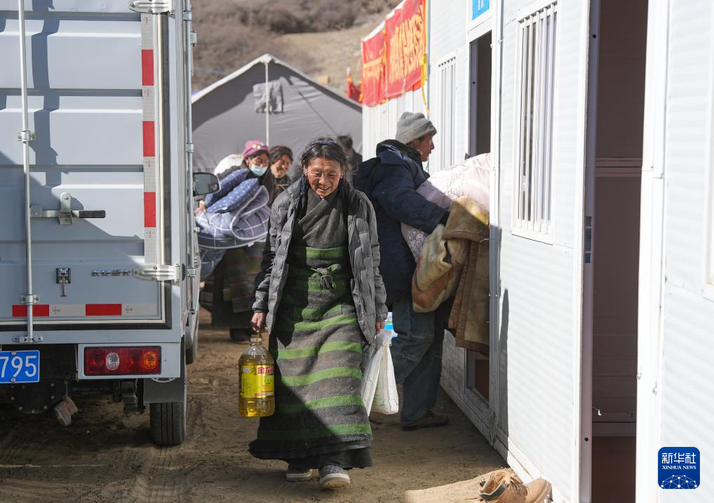 1月10日,在定日县长所乡古荣村,受灾群众将过冬物资从临时安置帐篷搬入板房。