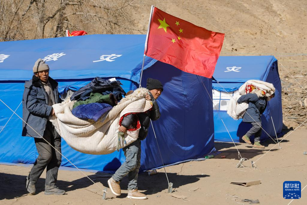 1月10日,在定日县长所乡古荣村,受灾群众准备将个人物品从临时安置帐篷搬入板房。