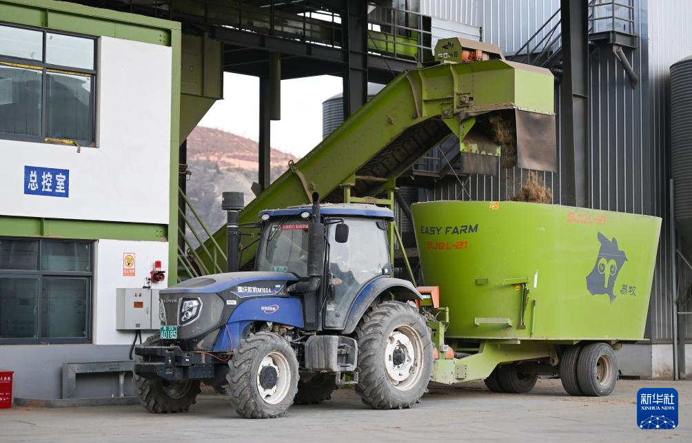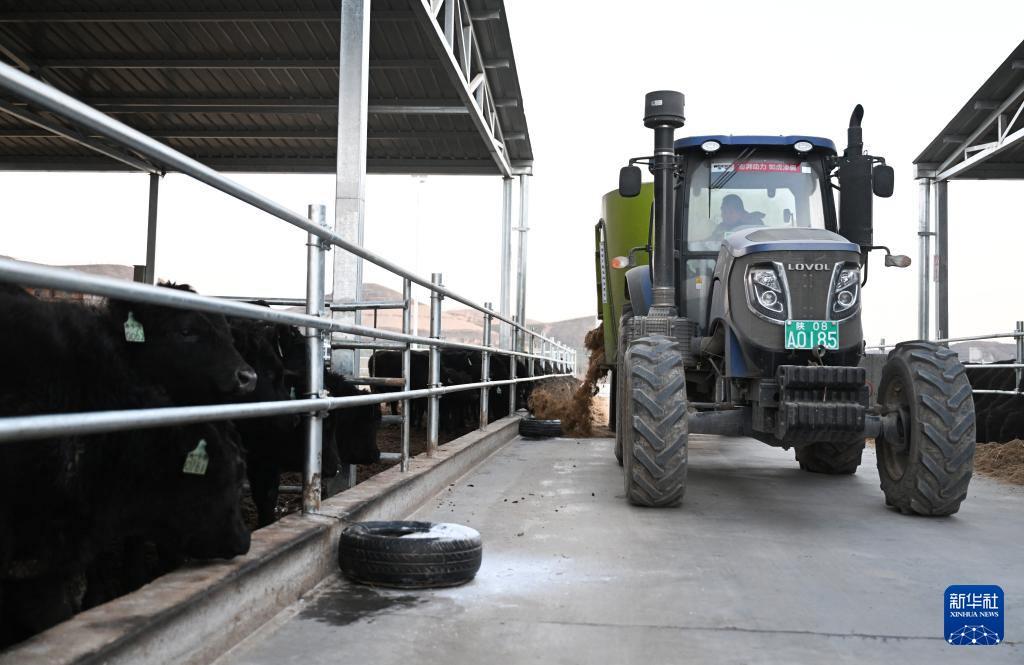 1月9日,在位于陕西省榆林市清涧县的陕西外经贸国际农业合作有限公司黑牛养殖基地,工作人员操作设备投放饲料。